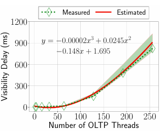 因此,除了受物理限制(即网络内延迟)约束的数据传输时间外,影响可见性延迟的最重要参数是写操作的负载:写操作越多,意味着需要处理的数据越多,导致排队时间越长。此外,由于METISDB的增量存储是只追加的,来自行存储的分散更新也会追加到增量存储中。因此不需要考虑更新的分布情况。因此,METIS使用历史数据来估计可见性延迟,这些历史数据将OLTP工作负载的并发性映射到可见性延迟。