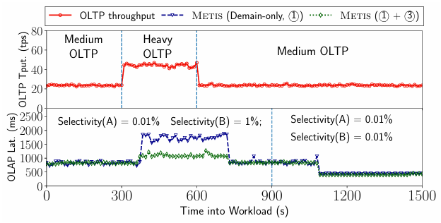 实验表明,重优化可以帮助METIS平稳适应工作负载的变化,同时保持工作负载之间的性能隔离,并提供合理的OLAP性能。