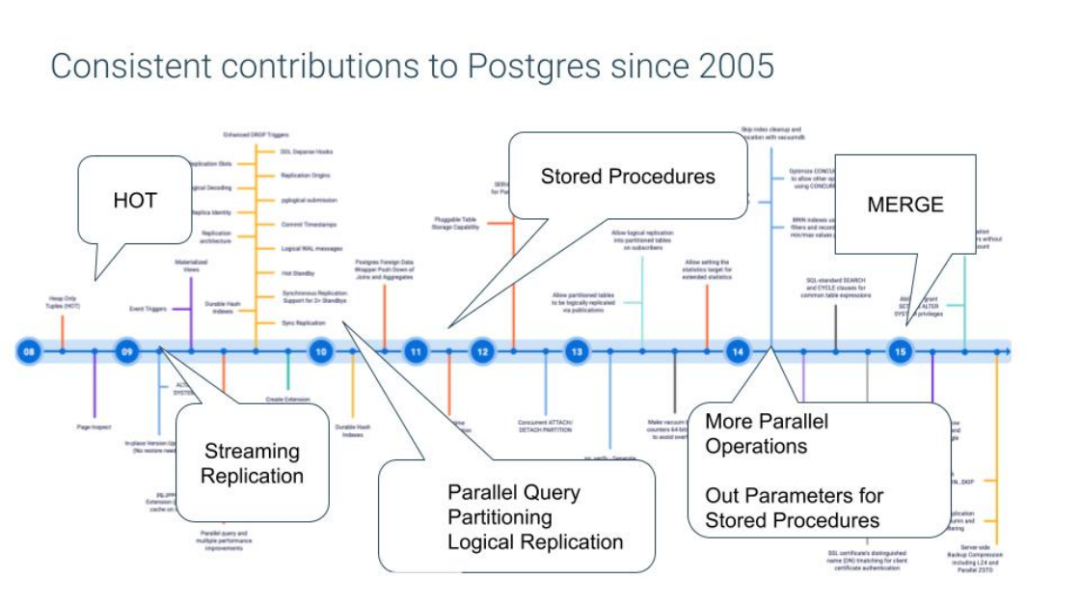 EDB于2020年收购了第二象限Quadrant公司,对Postgres的做出了许多贡献。一些最有影响力的贡献包括: