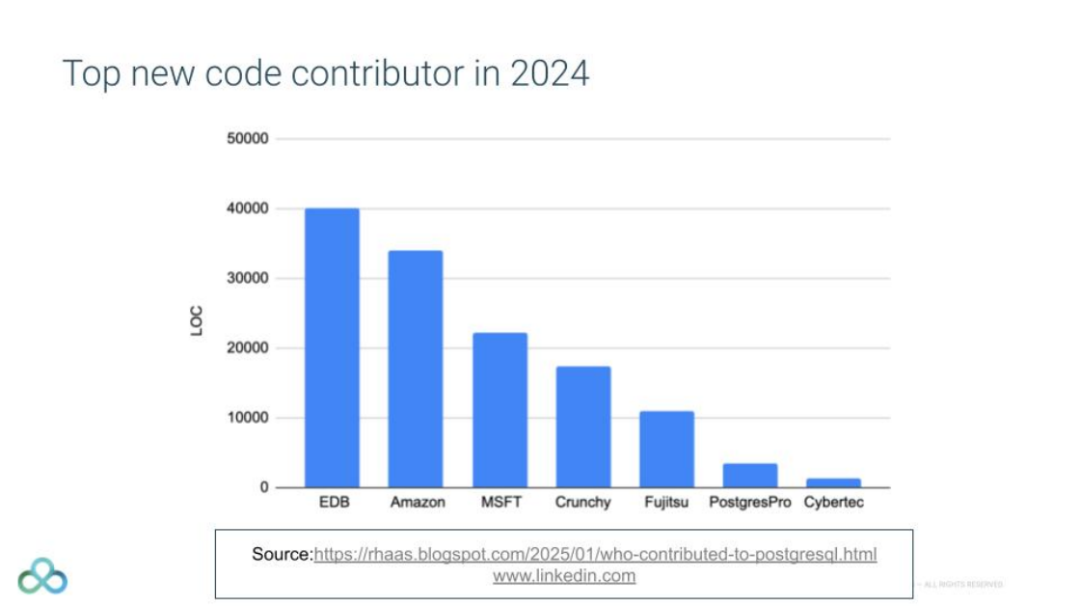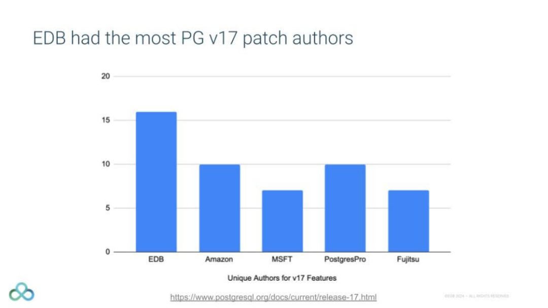 EDB 在 2024 年为 Postgres 贡献的代码量超过了其他任何公司,并且在 PostgreSQL 17 中拥有最多的补丁作者。这不仅展示了 EDB 在技术上的领先地位,也体现了其对开源社区的持续承诺。