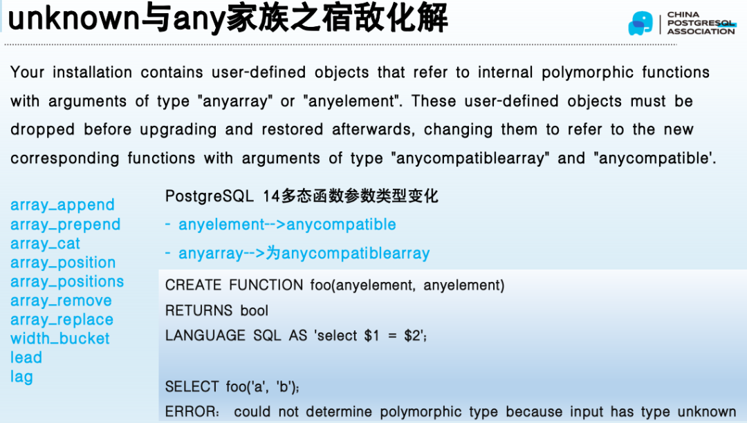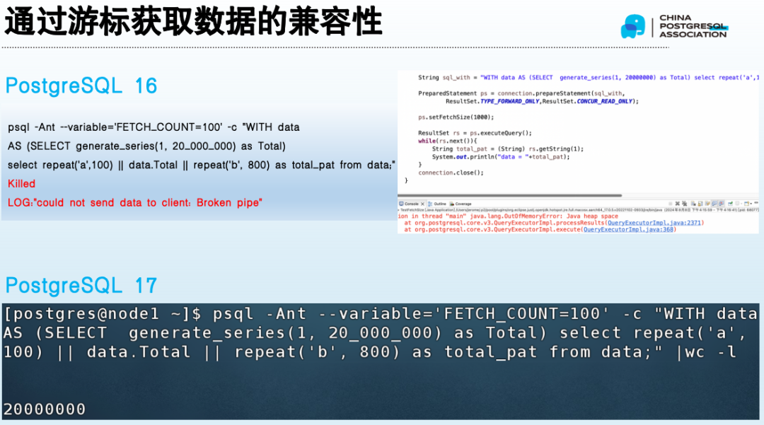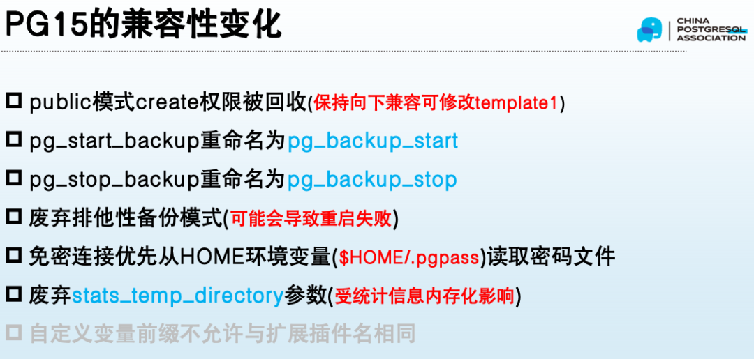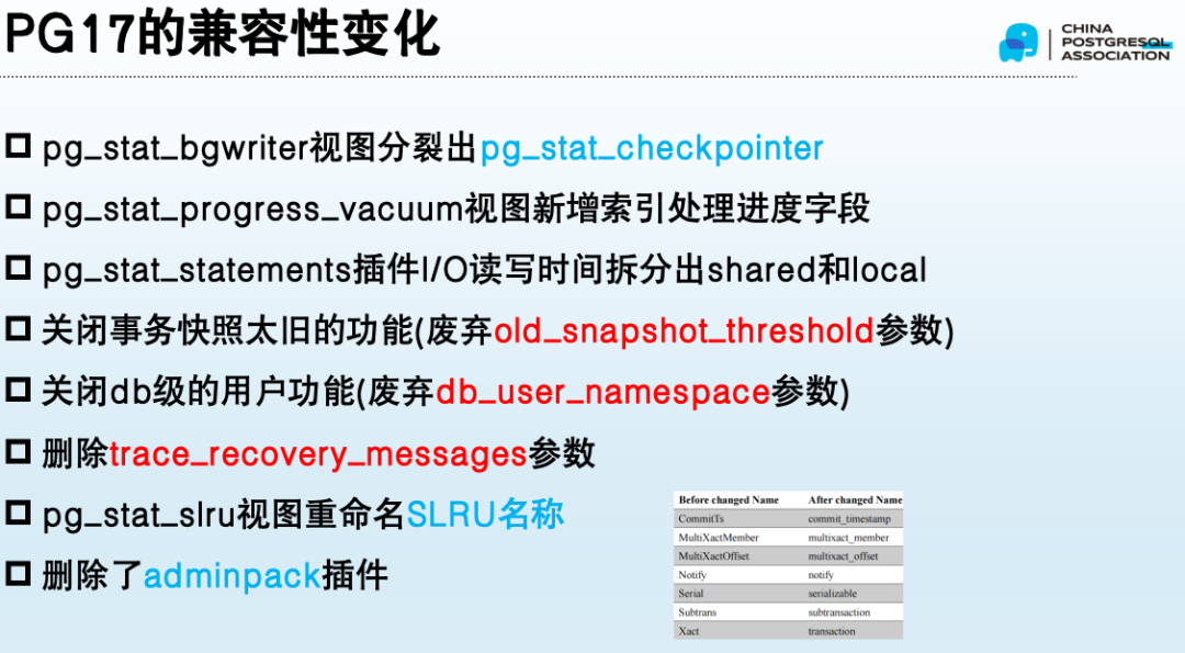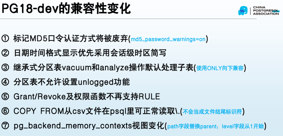 今天5月8号,PG 18 beta版本即将发布,结合上个月我在PG北京峰会线下分享的一些兼容性案例,分两部分介绍官方的大版本兼容性变化和一些民间兼容性案例。