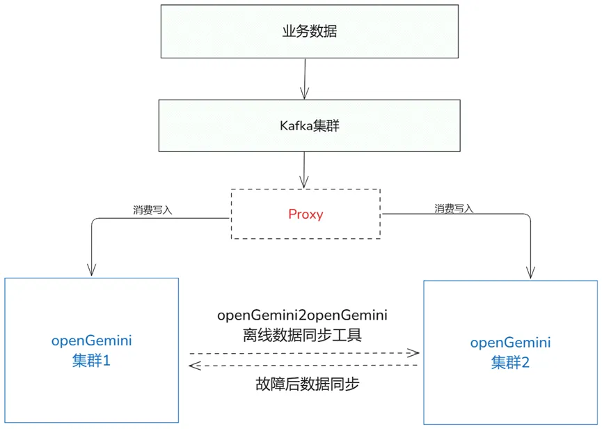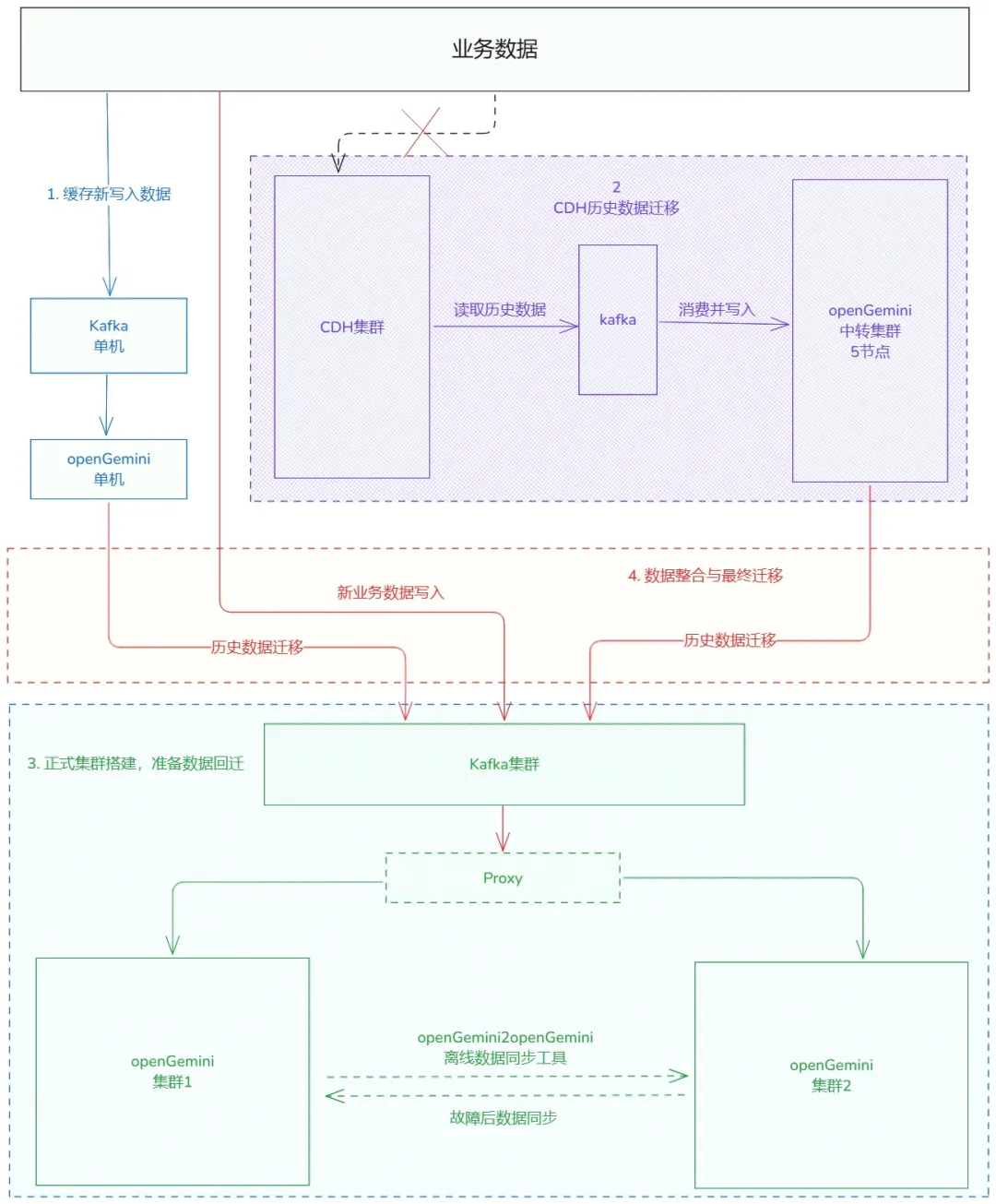 我们将中转数据库中的数据通过迁移工具写入新 Kafka 集群,并消费 Kafka 中的数据完成 openGemini 主备集群的写入。同时,新写入实时数据也被接入到新 Kafka 集群中,单机版 openGemini 的数据也成功迁移到主备集群。至此,整个迁移工作圆满完成。