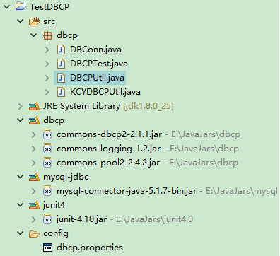 下图是在Eclipse中创建的Java工程,使用了DBCP相关的jar包,mysql的jdbc驱动jar包,junit4 。