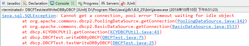 而如果将修改配置项removeAbandonedTimeout=180,即一个连接用完后会等待180秒,超过180秒后才由DBCP连接池回收,重新执行testWriteDBByDBCP()方法,执行一段时间后报错(Cannot get a connection, pool error Timeout waiting for idle object),如下: