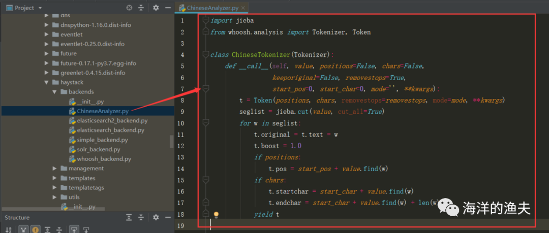 在haystack/backends目录下创建ChineseAnalyzer.py