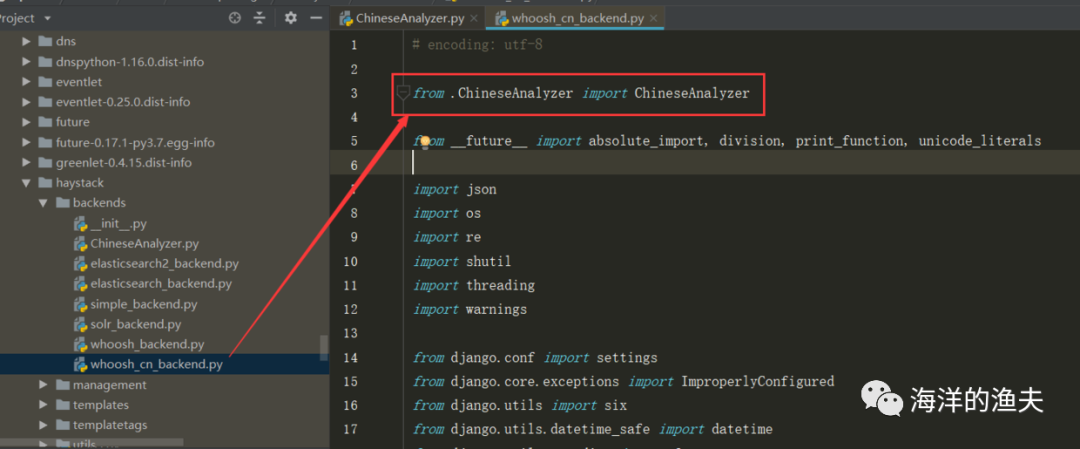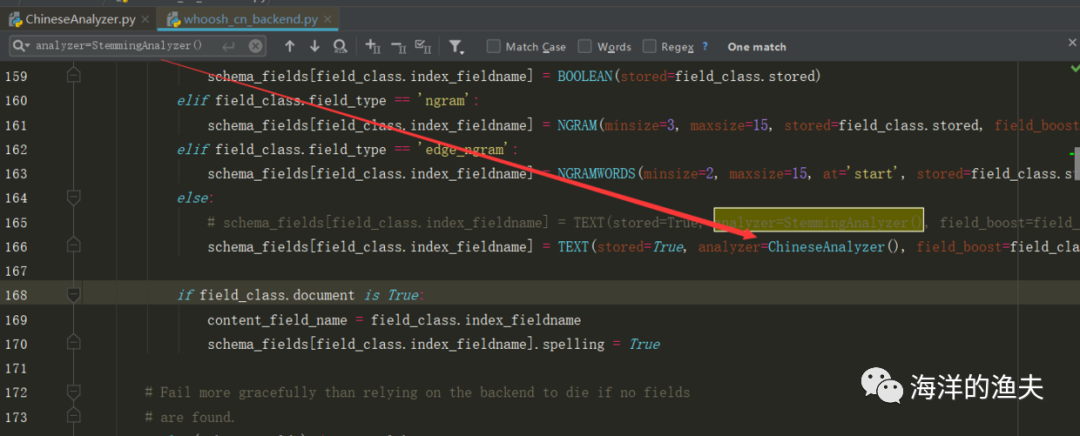 打开复制出来的新文件whoosh_cn_backend.py,引入中文分析类,内部采用jieba分词。