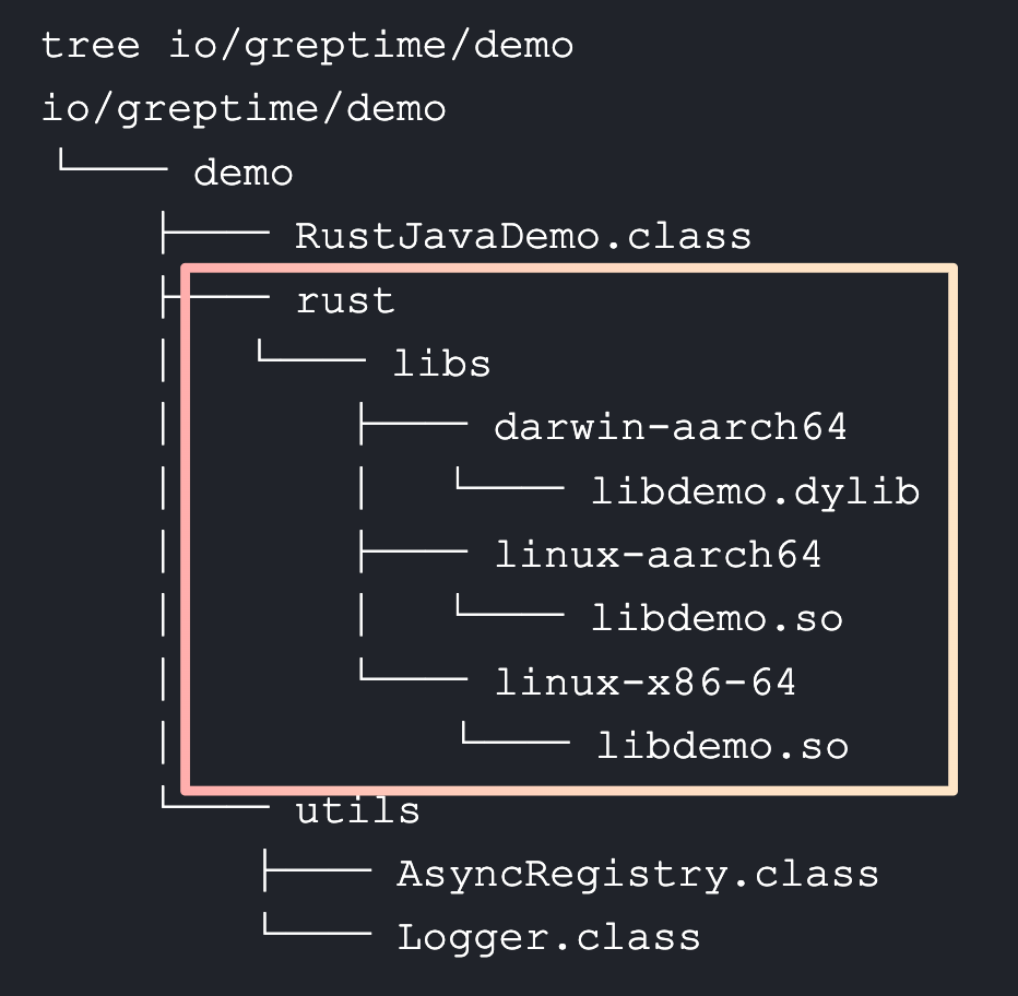 有没有方法打出多平台合一的 JAR 包呢?其实非常简单,将不同平台的 Rust lib 放在 JAR 的不同目录下,运行时根据当前平台动态加载即可。