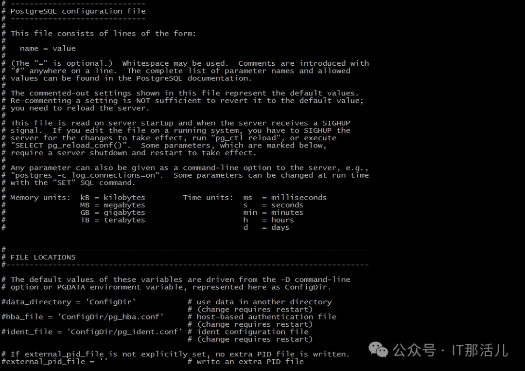 当我们打开 postgresql.conf 查看内容,会看到非常多的参数。其他大多数被注释了,意味着自动被赋予缺省值。