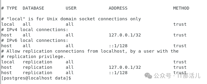 pg_hba.conf是PostgreSQL的客户端认证配置文件,用于控制如何验证用户连接。通过编辑这个文件,我们可以细致地指定哪些用户可以从哪些主机上以何种方式连接到数据库实例中的哪个数据库。