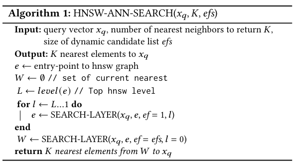 指定。HNSW搜索算法从多层图最上层的预定义入口点开始遍历。然后,遍历过程采用从顶层向下的迭代搜索策略。在每一层,使用贪婪搜索选择一个节点,该节点成为进入下一层的入口点。到达最底层后,搜索算法不是贪婪地选择单个节点,而是贪婪地选择