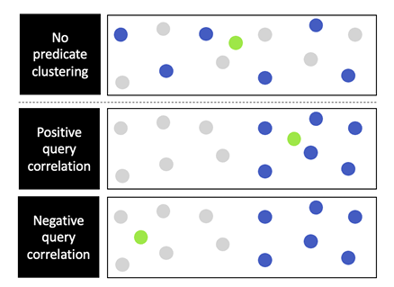 中的向量在X中分布不均匀,而是相对于X中的向量聚集在一起时,就会出现查询相关性。我们将这种现象称为谓词聚类。当谓词聚类发生时,查询向量可能与包含其搜索目标的谓词聚类接近或远离,从而引发查询相关性。
