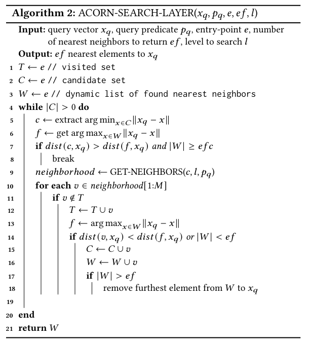 上述算法概述了ACORN从顶层预定义入口点开始,在每一层使用的贪婪搜索算法。ACORN搜索算法与HNSW搜索算法的主要区别在于,在每个访问节点