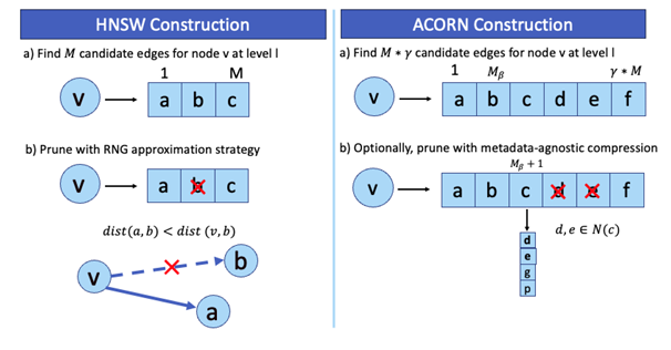 诱导的子图。通过修改了HNSW构建算法,使得任意谓词子图都能模拟HNSW权威分区索引,而无需显式构建。ACORN-γ通过构建一个更密集的HNSW版本来实现这一点,同时,ACORN-1通过在搜索期间而不是构建期间扩展邻居列表,来近似ACORN-γ的密集图结构,而无需实际构建它。