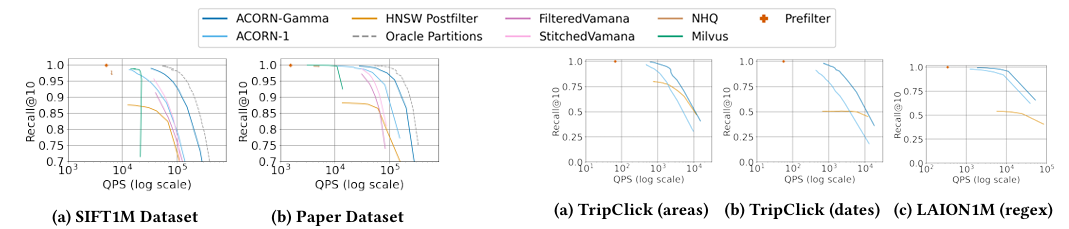 上图右侧显示,在TripClick和LAION-1M数据集上,ACORN在召回率为0.9时,QPS比基线方法高出30-50倍,并且如前所述,ACORN-1 近似于ACORN-γ的搜索性能。在这两个数据集上,预过滤的成本过高,虽然能获得完美召回率,但牺牲了效率。而后过滤无法获得高召回率,这可能是由于存在不同的查询相关性和谓词选择性。
