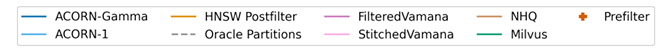 本实验中的基线有:ACORN-γ、ACORN-1、预过滤、HNSW后过滤、Filtered-DiskANN、NHQ、Milvus和Oracle Partition Index。