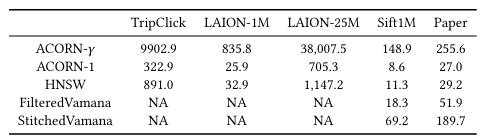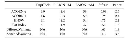 相比而言,ACORN-γ由于生成的扩展边列表,使索引构建时间TTI增加了