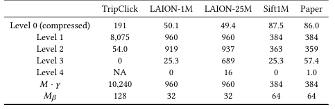 鉴于ACORN-γ的构建开销较高,实验研究其无谓词依赖压缩策略在降低索引构建成本同时保持搜索性能的效率。表格显示了ACORN-γ每个数据集每一层的平均出度,证实了对第0层进行压缩会导致邻居列表明显小于未压缩层,未压缩层的邻居列表可能大至