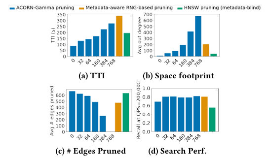 试验结果表明,ACORN的剪枝可以通过积极修剪候选边显著降低TTI和空间占用,同时保持搜索性能。相比之下,对索引应用HNSW剪枝会导致混合搜索性能显著下降。同时,基于元数据感知的RNG剪枝在搜索性能上与ACORN-γ的剪枝相似,但在
