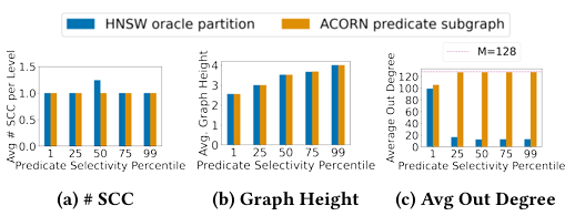最后,实验研究ACORN-γ谓词子图的图质量,比较了HNSW权威分区和ACORN-γ谓词子图在TripClick数据集的真实混合搜索查询中,不同谓词选择性下的图连通性、图高度和出度。