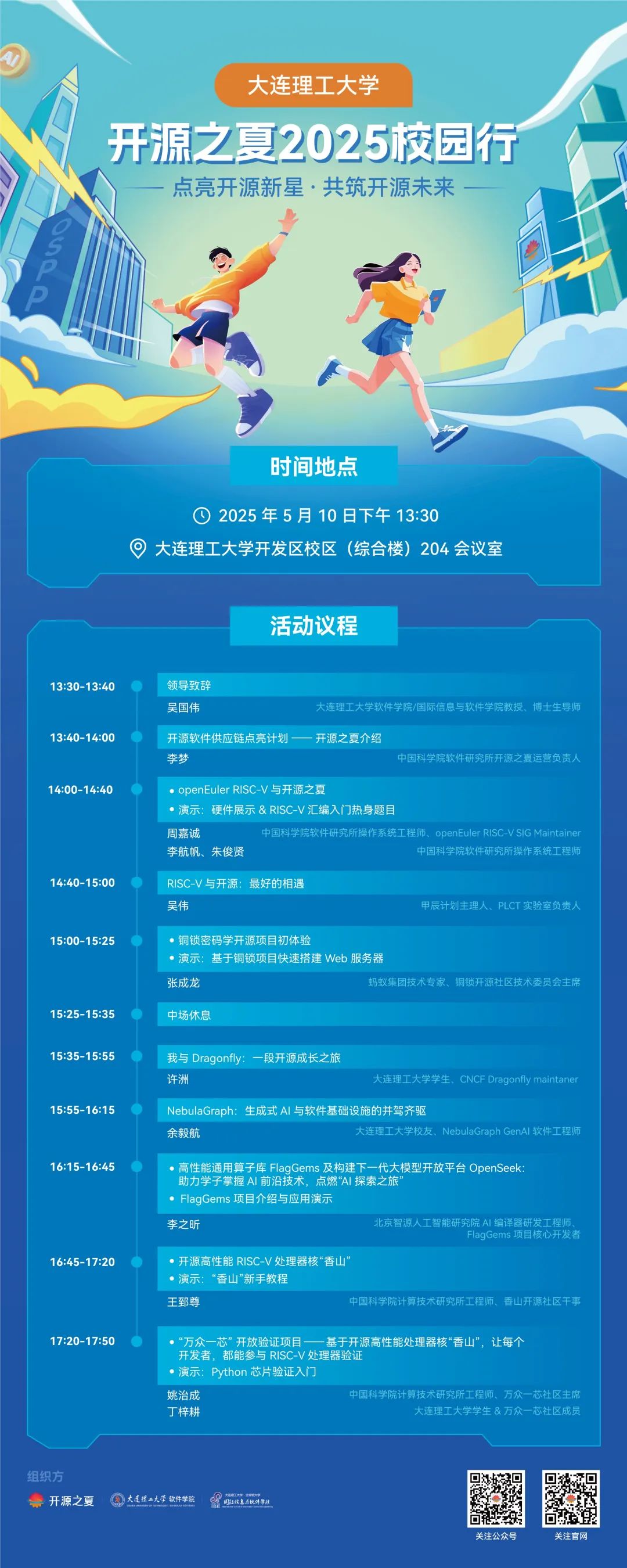 开源之夏2025年度校园行也拉开帷幕,开源之夏将继续携手众多优秀开源社区,以面对面分享、加入实操演示的方式将开源带入更多校园。第一站,我们将走进“海纳百川 自强不息 厚德笃学 知行合一”的大连理工大学。