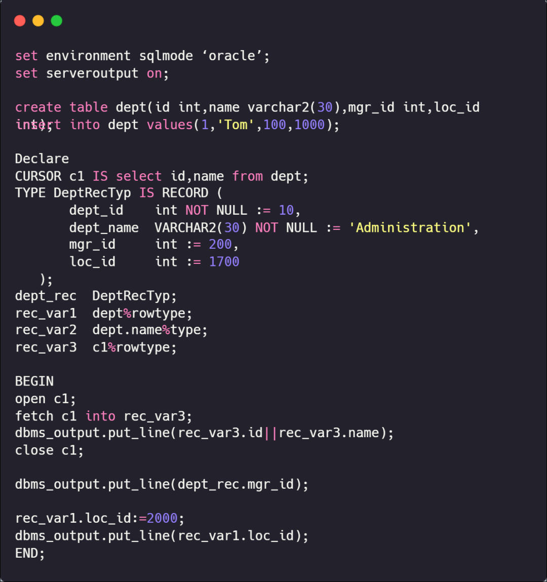 要使用PL/SQL语法,需要显示设置环境变量 SQLMODE为ORACLE 。默认情况下,GBase 8s的SQLMODE为GBASE,此时不支持PL/SQL语法。因此,在开始编写PL/SQL代码之前,请确保已经正确设置了环境变量。
