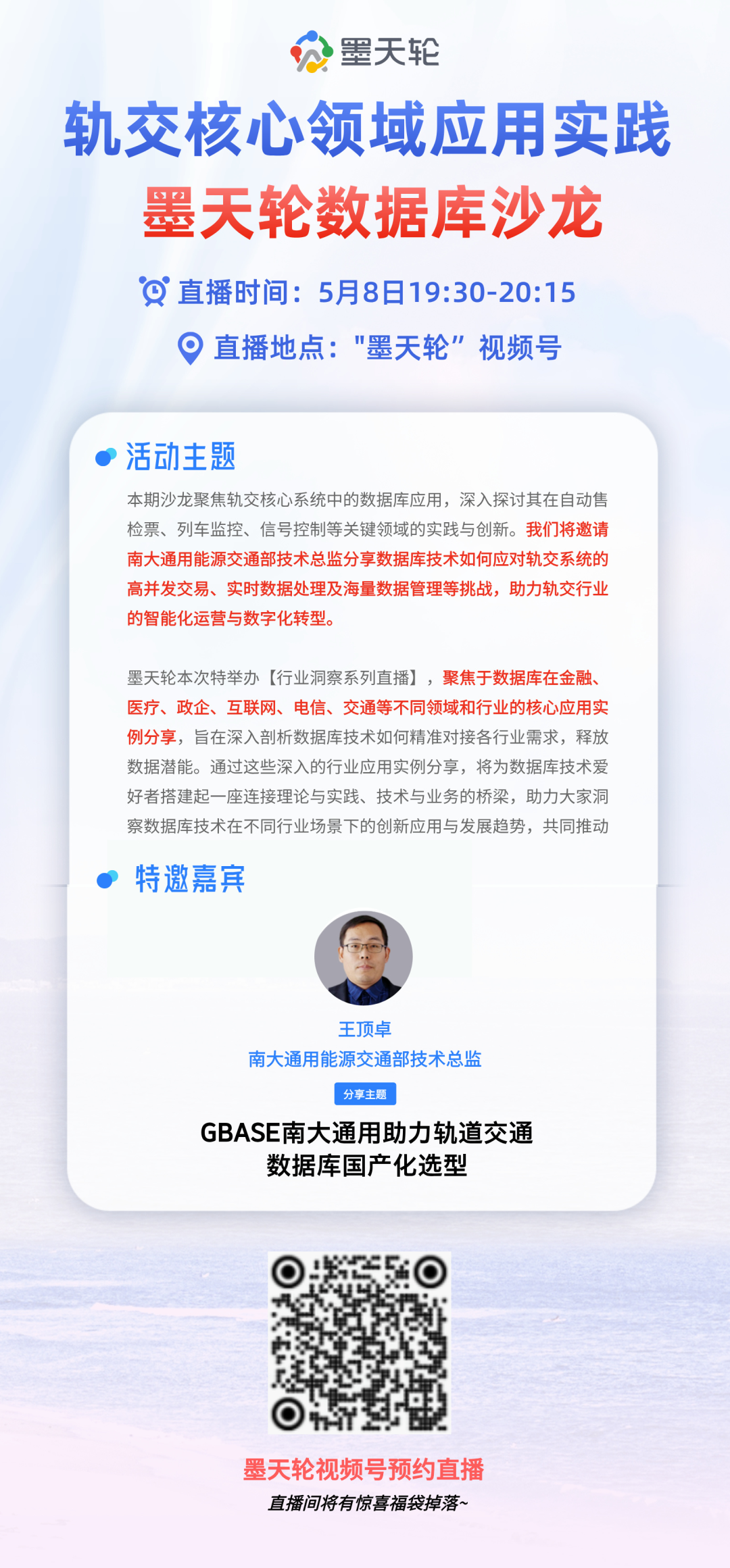 今晚19:30,南大通用能源交通部技术总监王顶卓将在直播间分享《GBASE南大通用助力轨道交通数据库国产化选型》的主题演讲,在核心业务场景中感受GBase 8s的技术特性,直播间更有精美礼品抽送,欢迎大家预约观看~