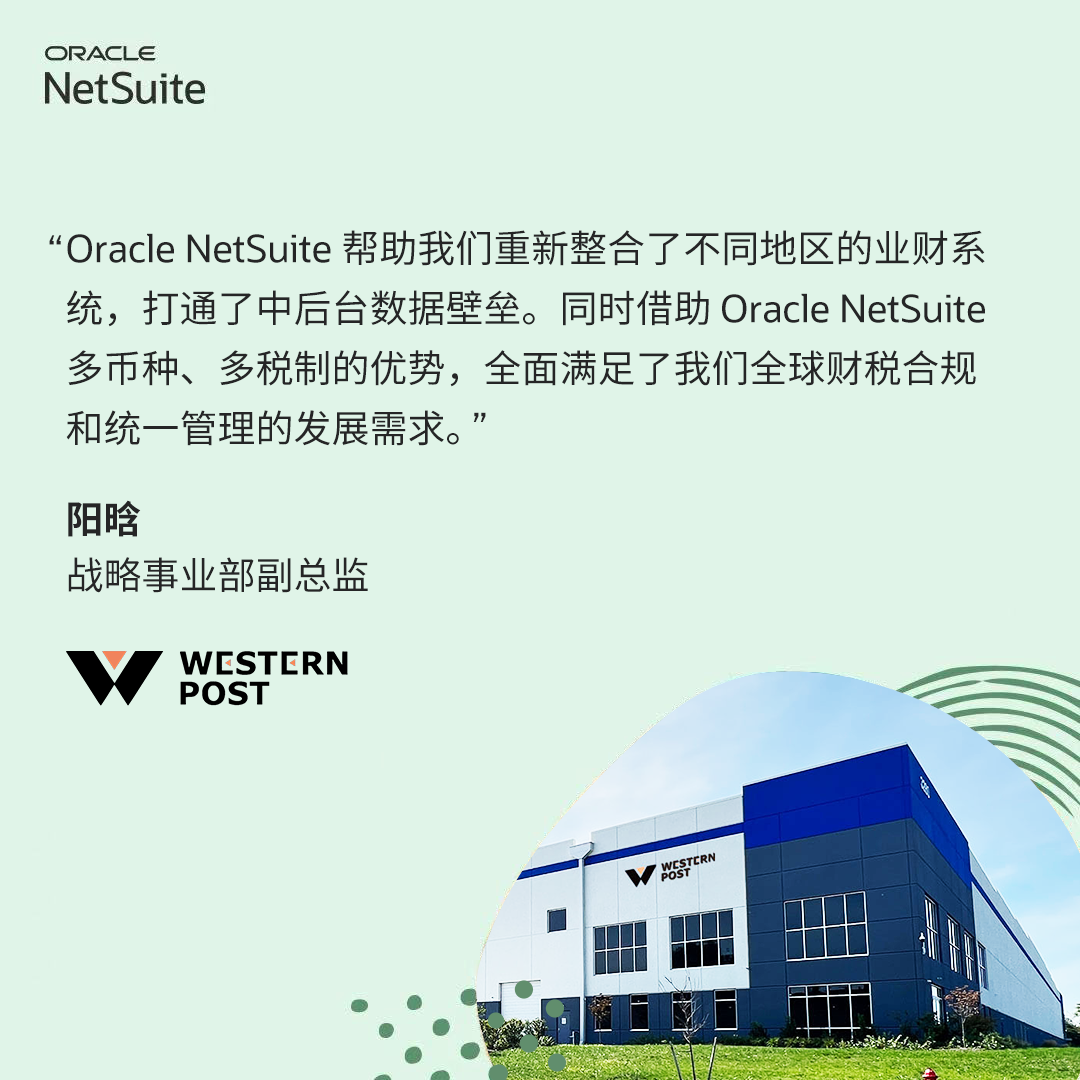 借助 Oracle NetSuite 打通西邮物流内部不同系统的数据,形成了统一的管理平台,集团预算和费用管控更精准,且能兼顾不同地区的财税合规需求,降低了业务合规风险。