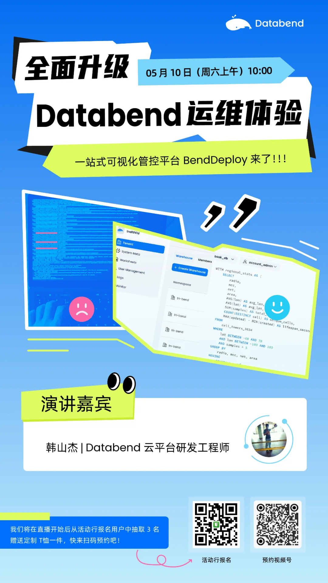 我们将邀请 Databend 研发工程师韩山杰详细介绍该平台的功能特性,并手把手带你在几分钟内完成一套 Databend 的多租户、多集群私有化部署,以及如何通过直观的界面轻松管理数据库资源,完成从部署、扩缩、升级,到日志查看、SQL 执行等全链路操作,解决传统方法对着 Shell 敲命令的痛点。