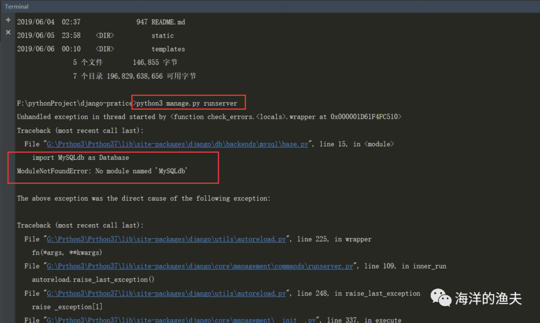 可以看到提示ModuleNotFoundError: No module named 'MySQLdb'