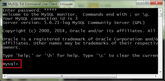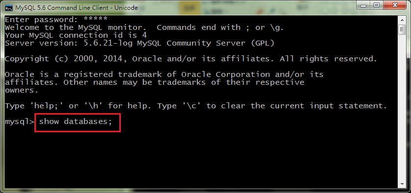 5、输入显示所有数据库命令:show databases; 一定要有分号,并按回车