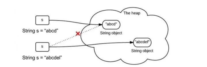 String不可变很简单,如下图,给一个已有字符串"abcd"第二次赋值成"abcedl",不是在原内存地址上修改数据,而是重新指向一个新对象,新地址。
