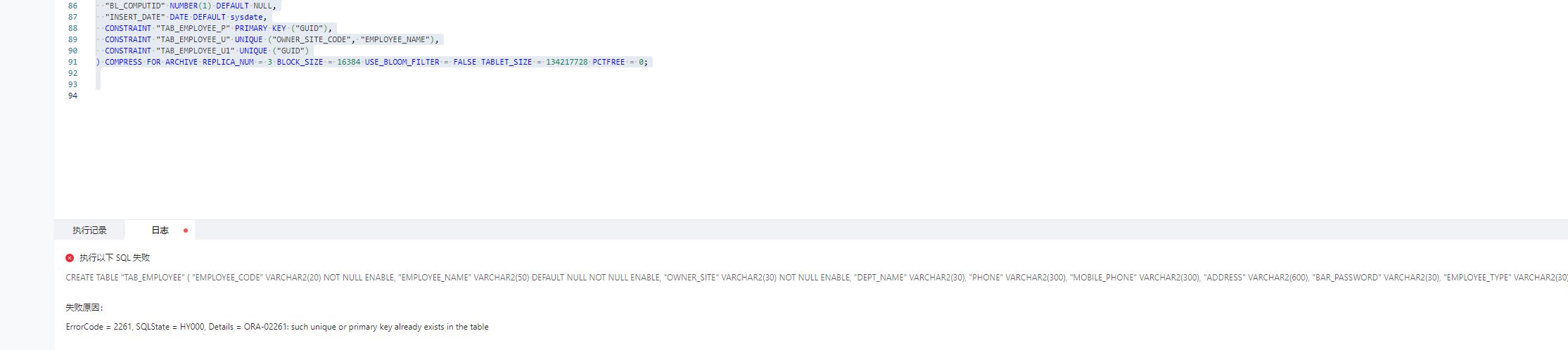 当将OB的DDL语句直接在新的OB或Oracle环境中执行时,会检测到重复的约束定义,导致表结构迁移失败。