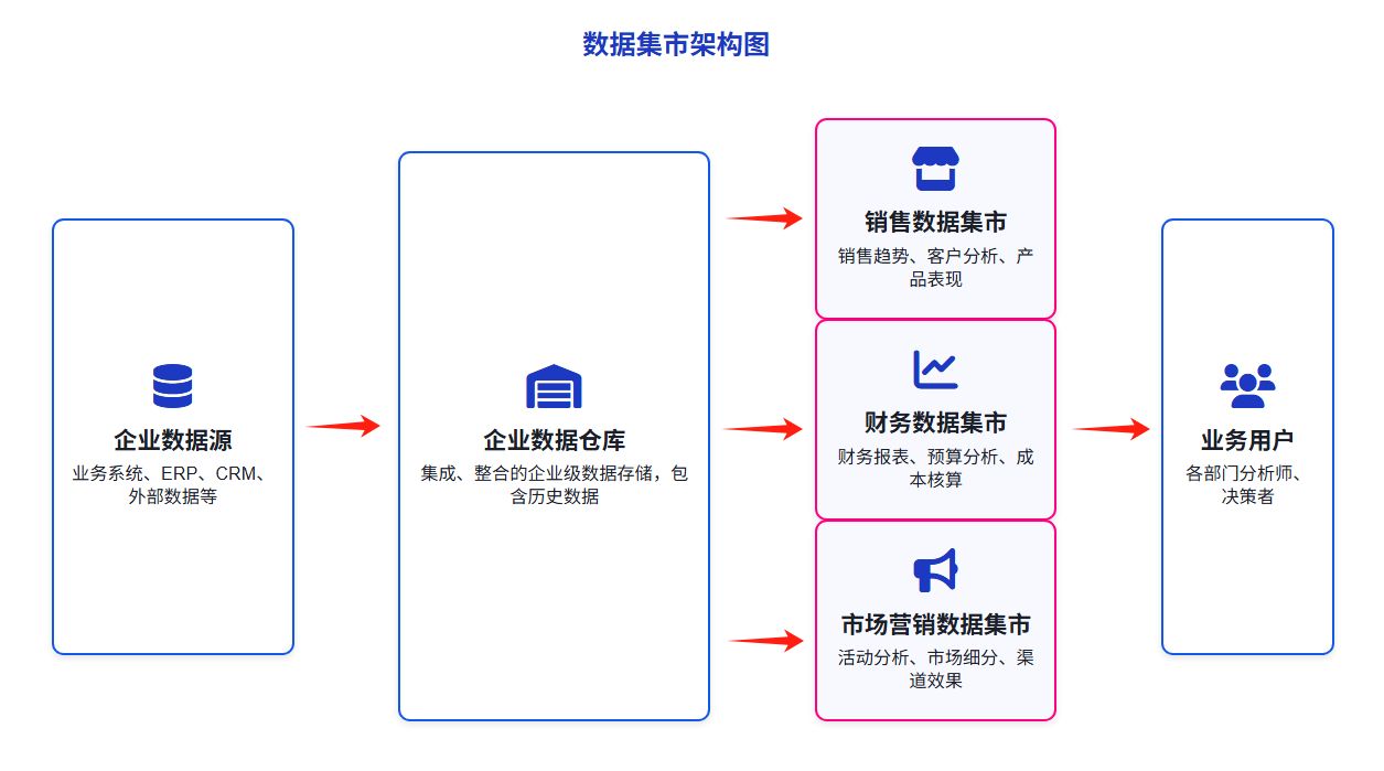 数据集市是企业数据仓库的一个子集,专门为特定业务部门或主题设计,提供定制化、结构化的数据存储和分析支持。它帮助企业更高效地满足部门级的业务分析需求,提升数据访问速度和决策效率。