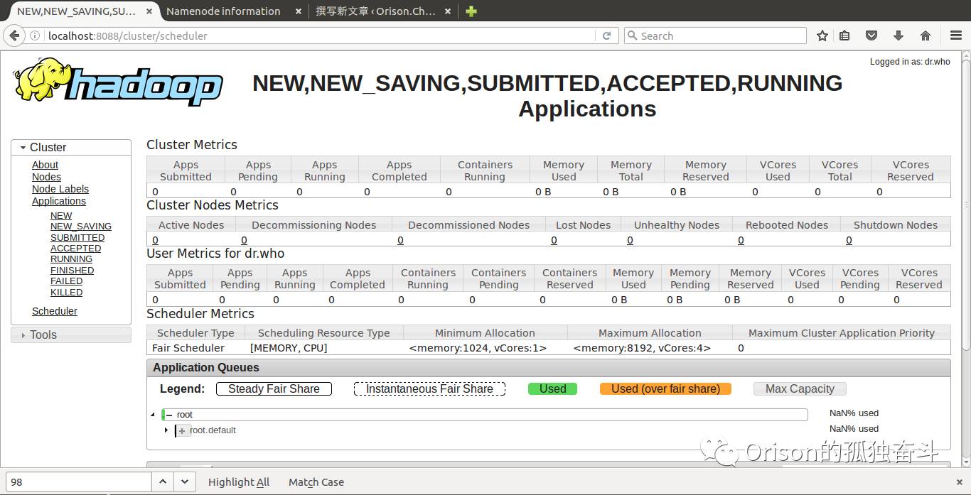 启动成功,可以访问到http://localhost:8088和http://localhost:9870,截图分别如下: