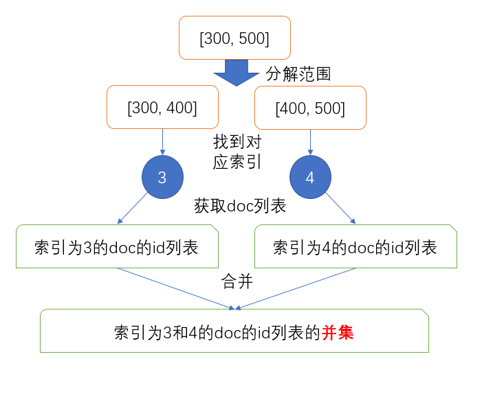 [423,642]之间的所有的文档,需要取出一共11个term,然后用这些term去搜索对应的文档。