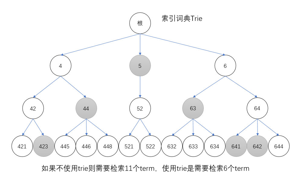 先在索引的trie里面找到这两个term以及范围内的兄弟节点,分别是trie的两个叶节点423、641和642 从叶节点向上缩小范围,对两个数字分别除以10加一和减一之后查找范围为 [43,63]