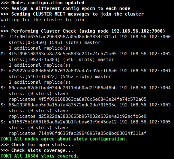 /data/project/redis-cluster/redis-5.0.5/src/redis-cli --cluster create 192.168.56.102:7000 192.168.56.102:7001 192.168.56.102:7002 192.168.56.102:7003 192.168.56.102:7004 192.168.56.102:7005 --cluster-replicas 1