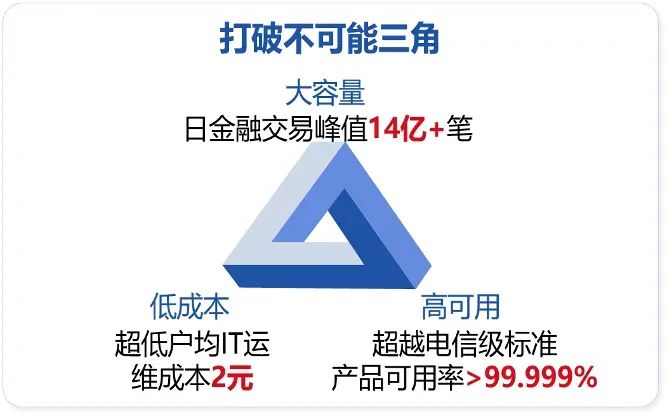 该系统凭借极低的运营成本,成功支撑起庞大客户群体以及高并发交易需求,一举突破了银行核心系统中大容量、低成本与高可用性难以兼顾的 “不可能三角”。即便在日交易峰值高达 14 亿笔的场景下,核心业务依然能达到99.999% 的高可用,超越电信级标准,同时,单账户年 IT 运维成本稳步控制在 2 元,仅为业界平均水平的十分之一。目前,微众银行已为 4.2 亿个人用户提供了全天候、无间断的优质服务,确保他们随时享受便捷的金融服务。此外,微众银行累计申贷的企业客户数超 580 万,以 “分钟级” 的高效服务为这些企业的资金需求提供强劲助力。