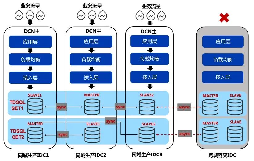跨城容灾的 2 副本通过同城的一个 slave 节点进行异步复制,实现跨城的数据容灾。基于以上部署架构,在同城可以做到应用多IDC多活,即联机的业务流量,可以同时从 3 个 IDC 接入,哪怕当中有任一 IDC 故障不可用,都可以保证数据 0 丢失,且秒级恢复数据库服务。
