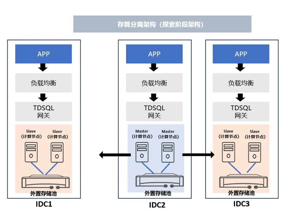 • 轻量化半集中式存算分离架构:3台存储盘框和若干计算节点构成一组数据库资源池(分布于同城三个IDC),提供若干个数据库实例服务。全网环境将由多组数据库资源池组成,形成轻量化半集中式存算分离架构,既解决了存算一体的架构痛点,也避免了存储过于集中带来的整体风险。
