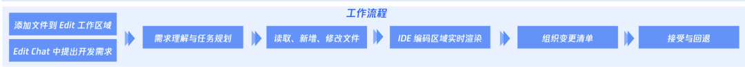 4月份,腾讯云Code Buddy推出的Craft智能体,用于「多文件自主AI协同编码生成」的产品交互突破。下图展示了一个包含六个步骤的软件开发工作流程图,流程依次为:在Edit Chat提出需求并添加文件、需求理解与规划、文件操作(读取/新增/修改)、IDE实时编码渲染、组织变更清单、接受或回退变更。