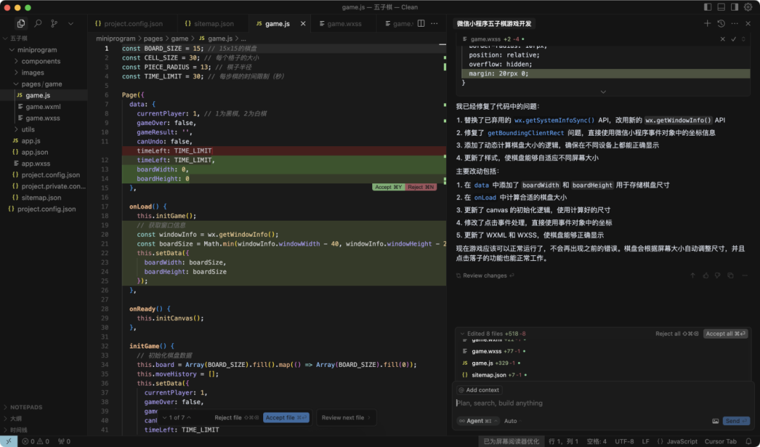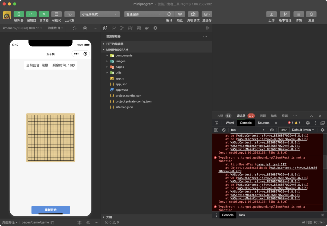 能落子,但无法很精准的落子到棋盘,并且游戏输赢逻辑也不对,但至少报错没有了。我进一步去优化问题。