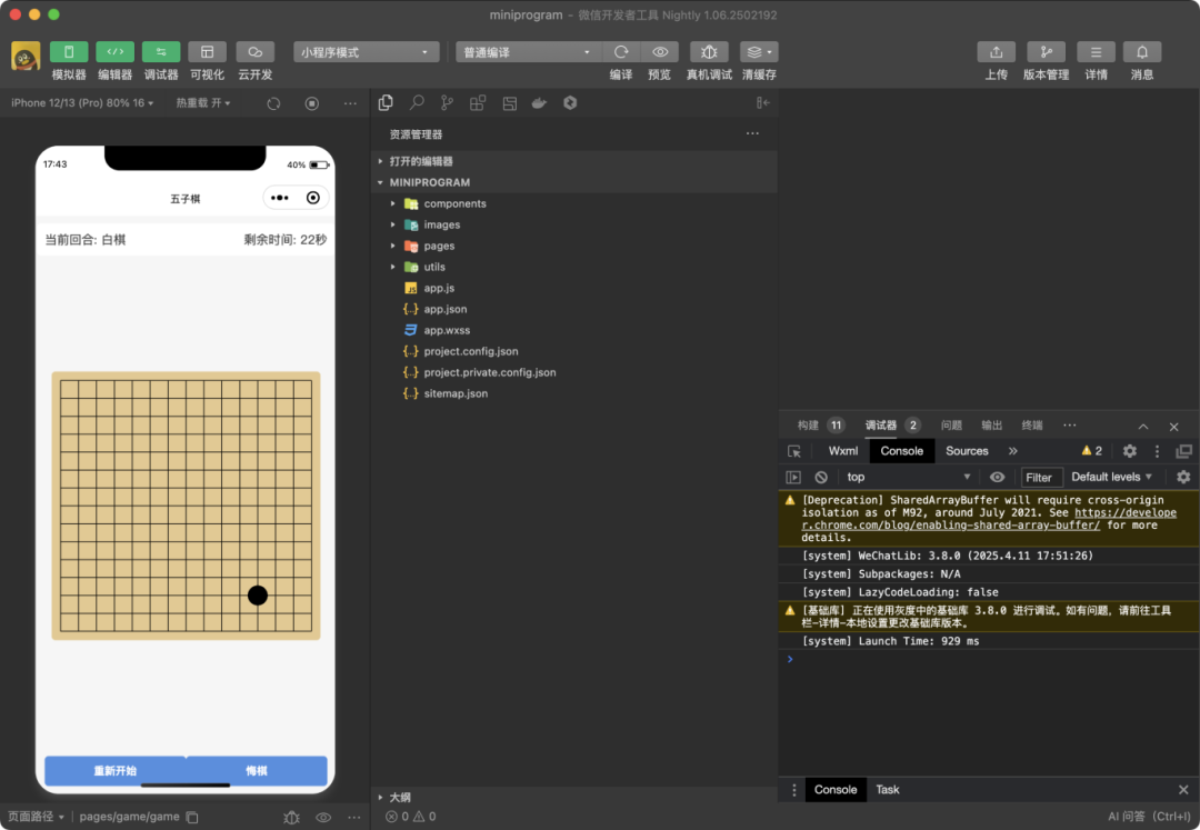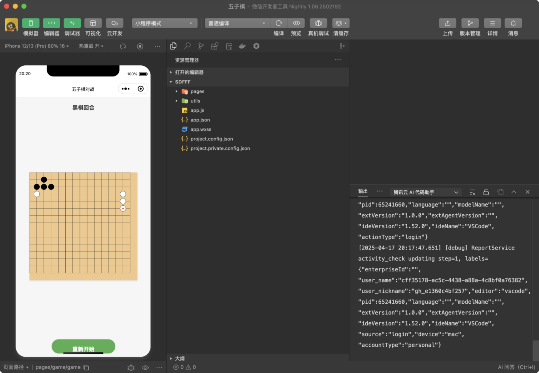 让我看看运行效果。打开微信IDE,导入工程。直接运行成功,并且落子正确。