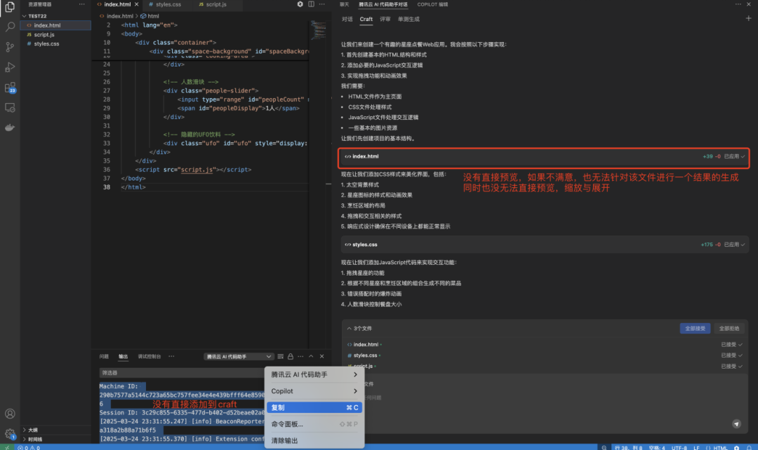 总体上 各插件在各方面存在一些差异性,Cusor属于原生IDE, 交互生成体验上可以超越插件本身,效果可以做到最优。作为喜欢本地IDE的用户会更倾向于选择和使用,但20美金的定价和数据代码外流也会劝退一些开发者。而腾讯出品的Craft能力,从应用生成的质量和效果上,算是目前不错的平替。由于在插件层面无法超越,所以生成的体验上中规中矩,细节处理上还有蛮多空间可以优化。团队基本上一天一个版本的节奏也是非常的卖力。Craft的Plan模式是一个很好的差异,在模型能力本身还无法完全比对最强claude模型的时候,通过Plan写清楚扩展完整需求,为接下来的任务拆解提供了更精准的信息和方向,无疑是一个很好的想法。