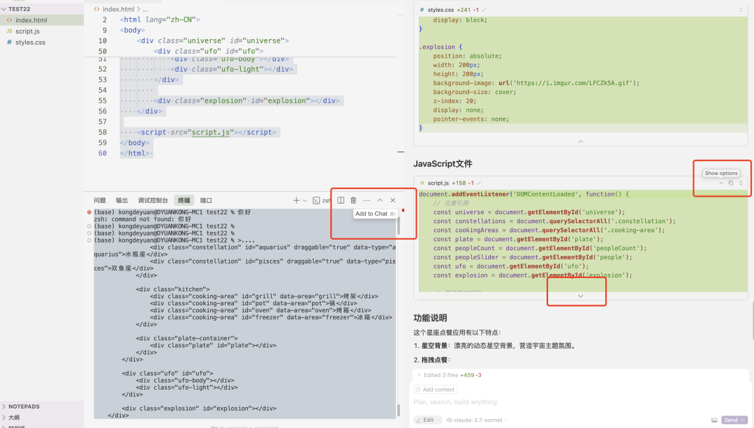 复杂任务处理 | 可以实现整体需求,过程中会报错,可以根据报错解决 ⭐️⭐️⭐️⭐️ | 可以实现整体需求,完成度和整体效果,页面效果更好 ⭐️⭐️⭐️⭐️ |