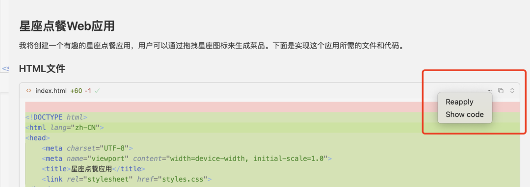 然后附上了每个操作的实现方案。你只需要点击「开始」按钮进入代码生成阶段。