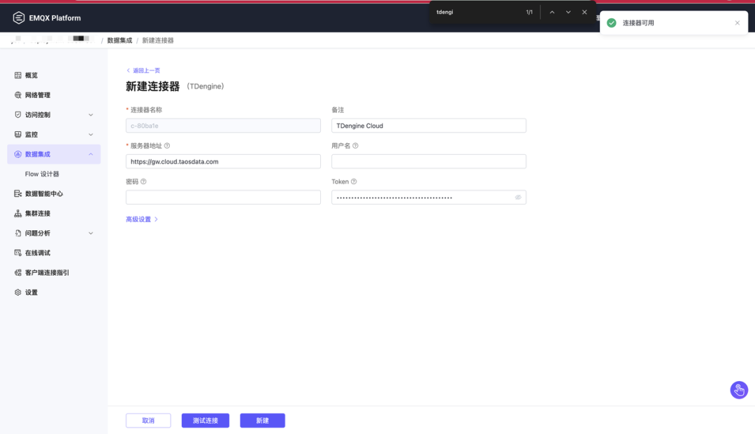 连接器名称:为连接器指定⼀个名称,如:TDengine Cloud。 主机列表:填写 TDengine Cloud 提供的连接(TDENGINE_CLOUD_URL的值)。 Token:填⼊从 TDengine Cloud 获取的访问令牌(TDENGINE_CLOUD_TOKEN的值)。 根据需要配置⾼级设置(可选)。