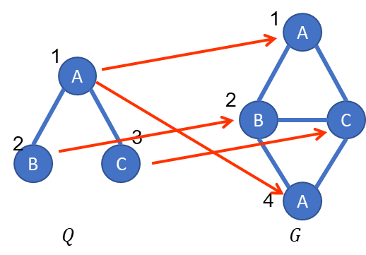 子图匹配问题是图算法领域经久不衰的研究问题,它是图分析系统的基石。该问题定义为:给定数据图 和查询图 ,找到 中所有与 匹配的子图。下图展示了一个子图匹配的例子。查询图 存在两个匹配。