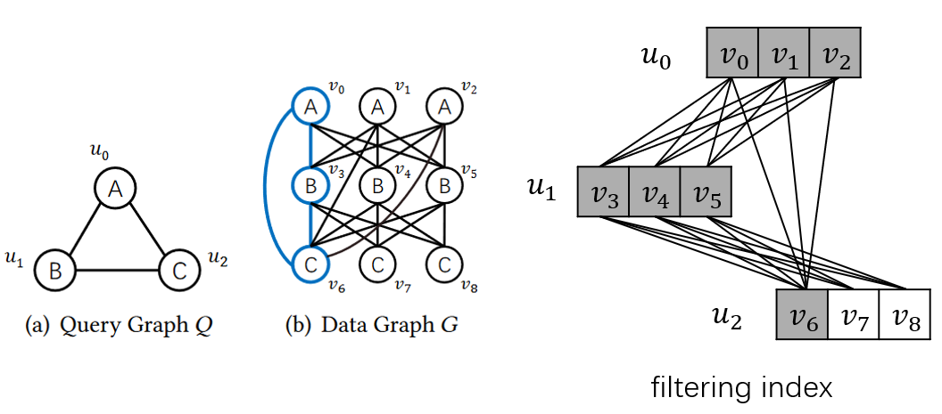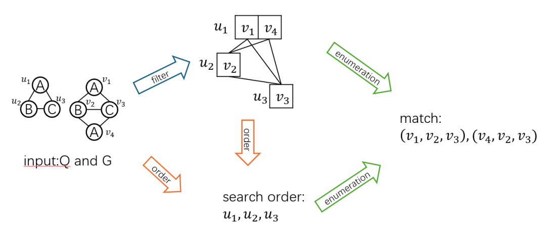 子图匹配算法一般分为 3 个步骤,分别是过滤,搜索顺序生成以及匹配枚举。其中过滤过程会通过特定的过滤规则获得每个查询节点的候选集。接着算法会根据查询图拓扑结构以及一些估计技术生成搜索顺序,用于指导枚举过程。最终,枚举过程搜索出所有的匹配。