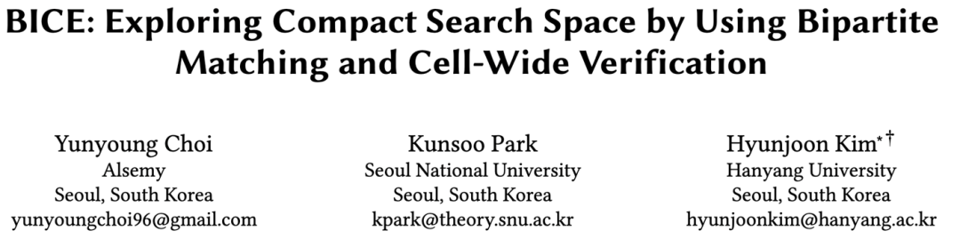 [6] Choi, Yunyoung, Kunsoo Park, and Hyunjoon Kim. "Bice: Exploring compact search space by using bipartite matching and cell-wide verification." Proceedings of the VLDB Endowment 16.9 (2023): 2186-2198.